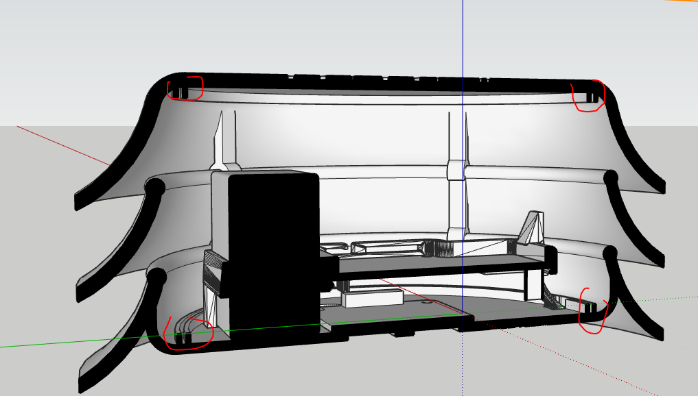 A recess for a 90° square bracket is present to one side of the BOTTOM part. One of the perimeter screws and a separate screw port, the 3rd port, from within the enclosure is used to fix the enclosure to the bracket. Given that you probably will have a different bracket than we did, you might need to adjust the position of the 3rd port in the sketchup file before you print.